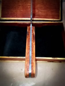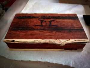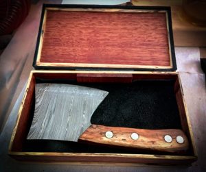 I found this Damascus blade made by a forge in Virginia, and as for Iowa, well, it’s not like there’s a tree that only grows there. But I did get a hold of some fallen & weathered maple, which upon running through the band saw presented some very interesting spalting. Then, I was able to get some enormously heavy eucalyptus support beams from an abandoned Iowa gypsum mine. This unlikely pair actually went together quite well, and I fashioned scales out of them, with an epoxy window at the end of the maple so the beautiful eucalyptus grain is visible. The box is eucalyptus with spalted maple trim, lined with black leather, and initialed in iron filings on the lid.